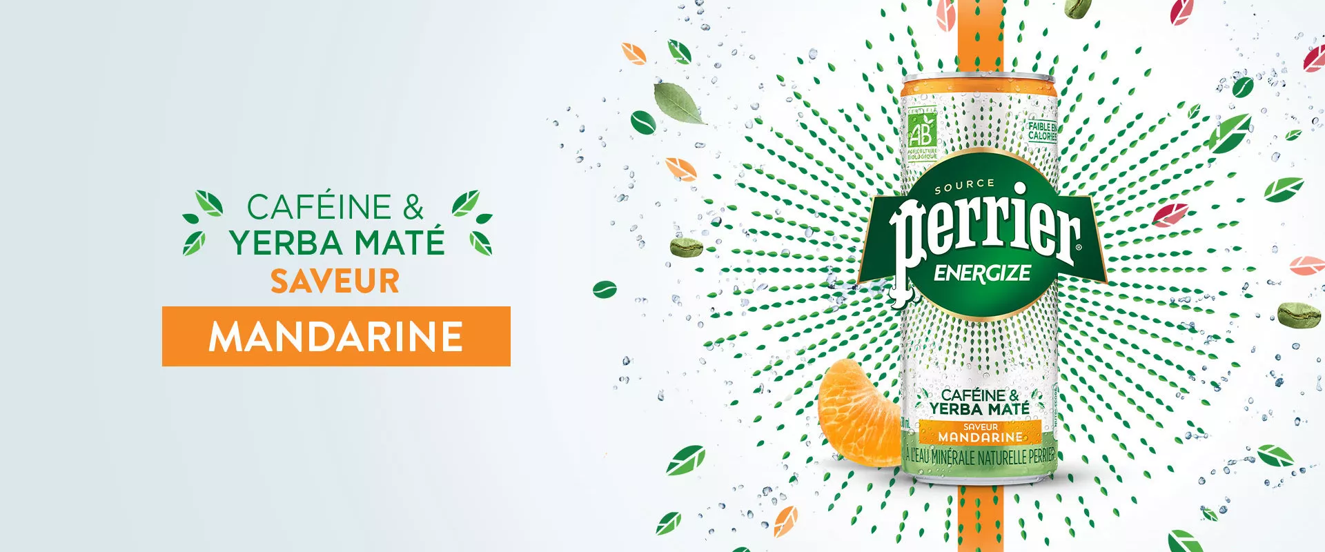 Besoin d'un petit coup de boost ? Découvrez PERRIER® Energize, la première boisson énergisante bio à base d'eau minérale naturelle (92%) et de caféine extraite de grains de café vert. En une canette, retrouvez tout l'esprit rafraichissant de l'eau minérale PERRIER®, avec son explosion de bulles, désormais boostée par des extraits de grains de café vert et une infusion de yerba maté biologiques. Revigorez-vous avec la saveur délicate et rafraîchissante de la mandarine. Faible en calories, certifiée biologique, et avec autant de caféine qu'une tasse de café (99mg), PERRIER® Energize vous permet de rester au top de vos capacités toute la journée !